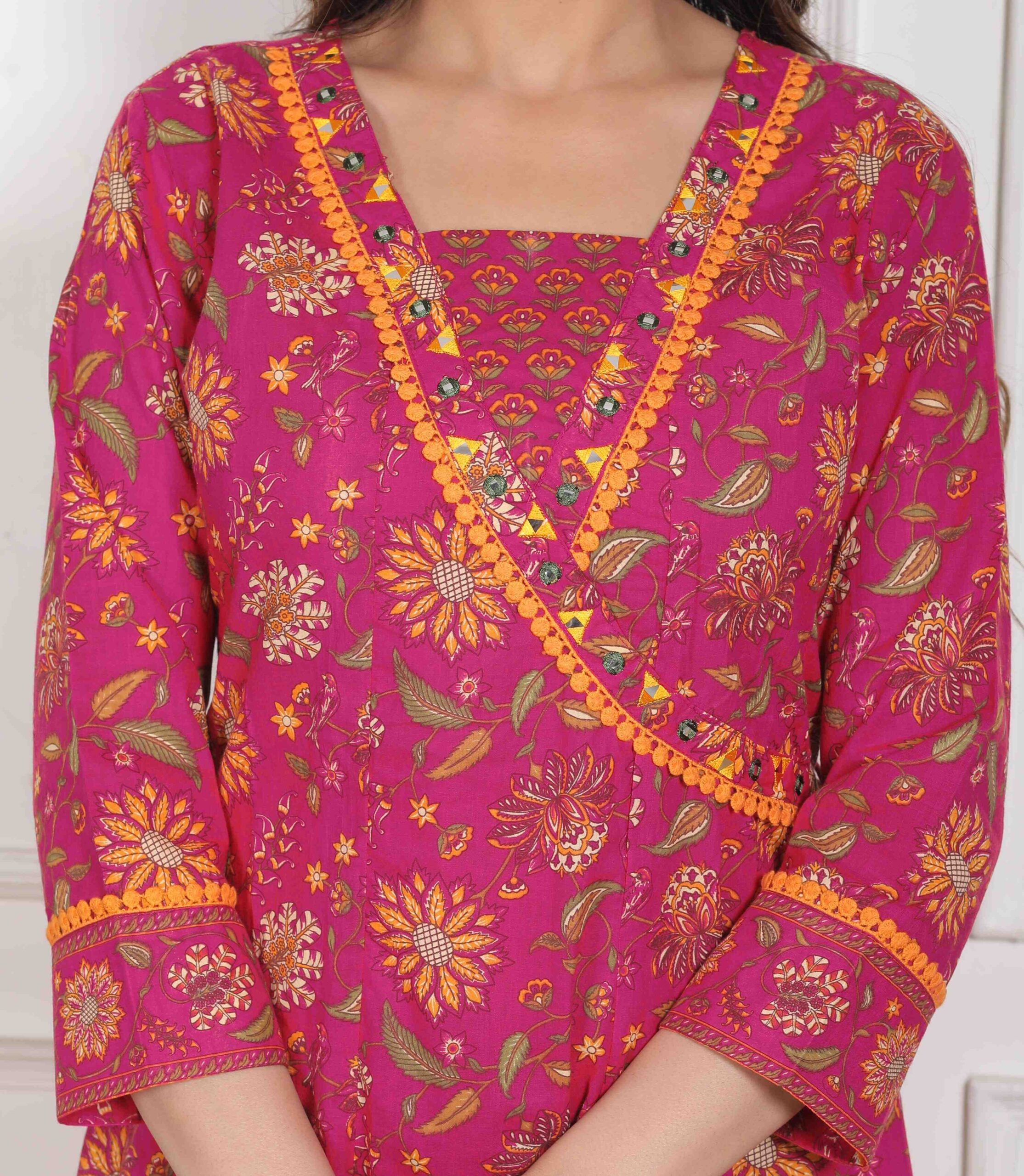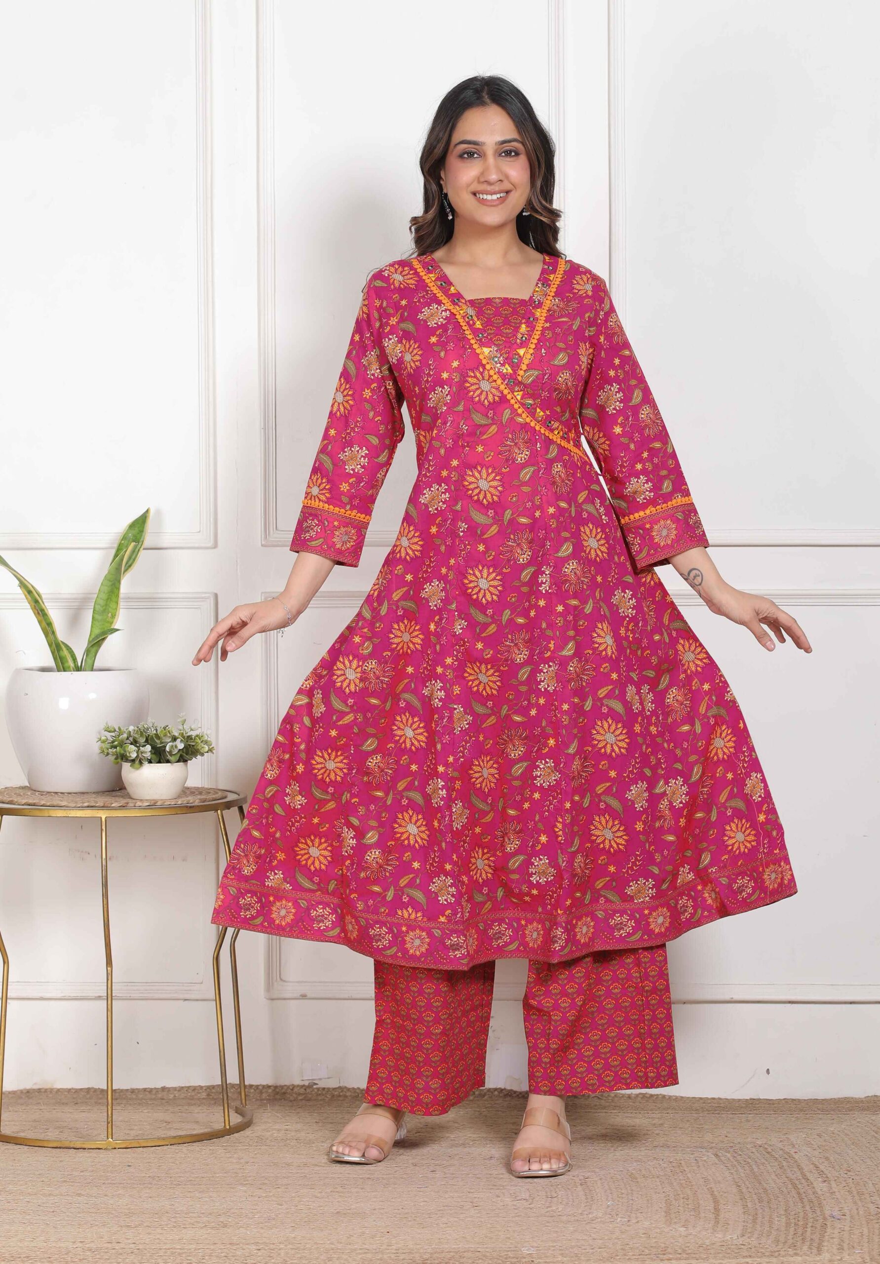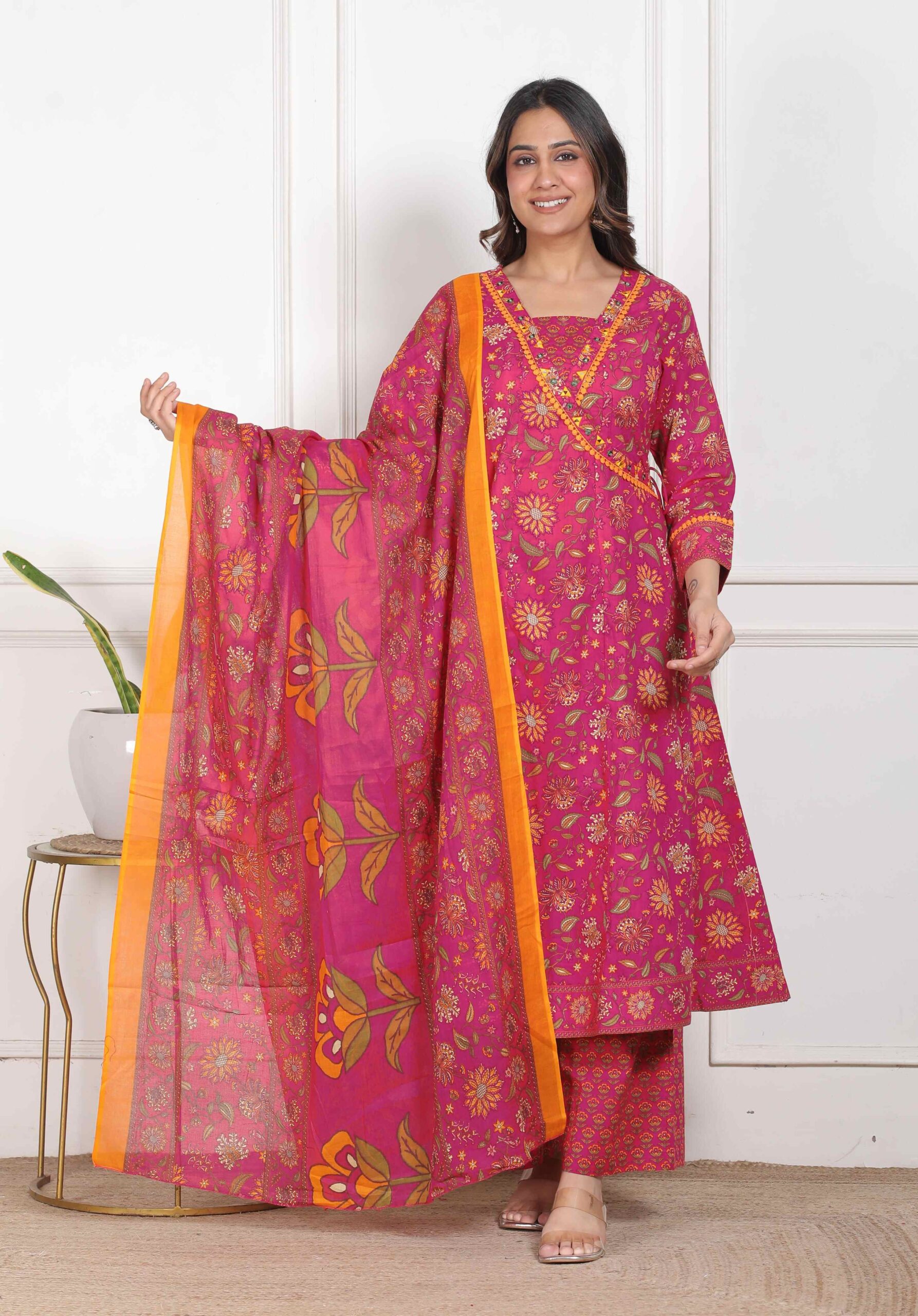 This elegant Anarkali three-piece ethnic set features a stylish kurta, comfortable pants, and a matching dupatta, perfect for various occasions.