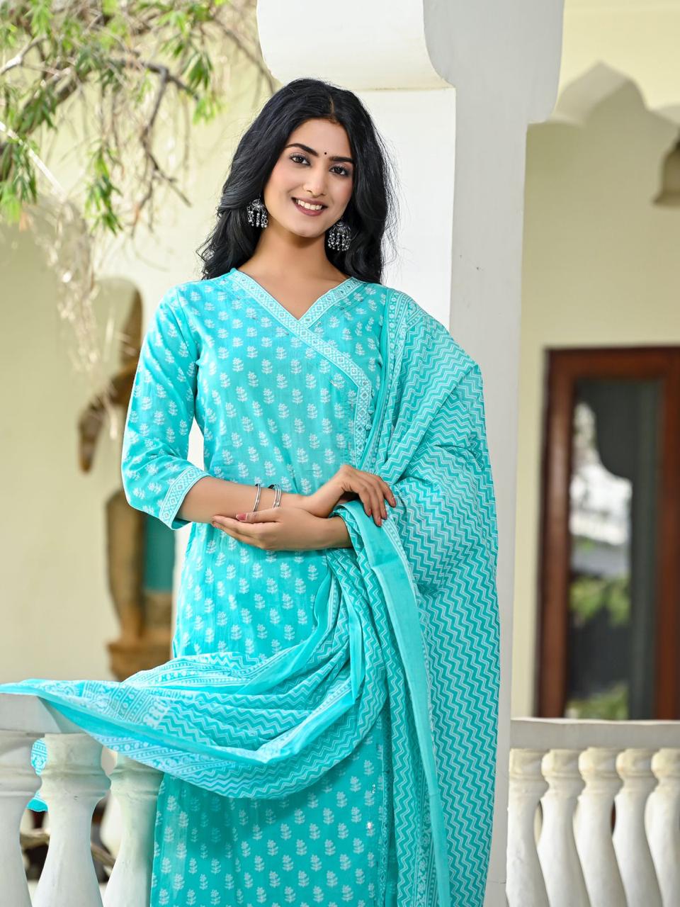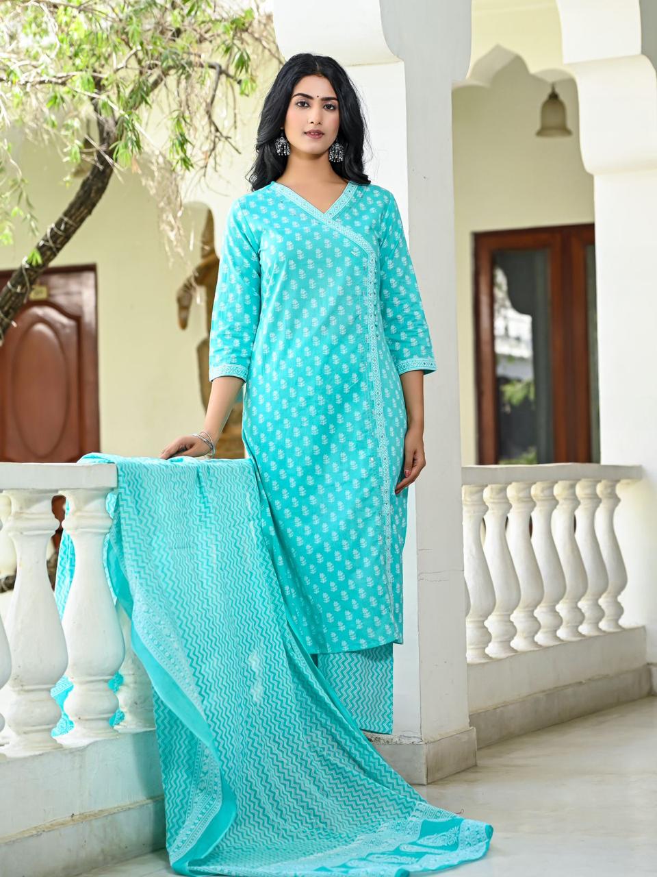 Shop this elegant 3-piece Mauve Purple Tone floral Print Angrakha cotton suit set from HK Vastra. Crafted in breathable cotton with a matching printed dupatta and pants. Perfect for everyday wear and festive charm!