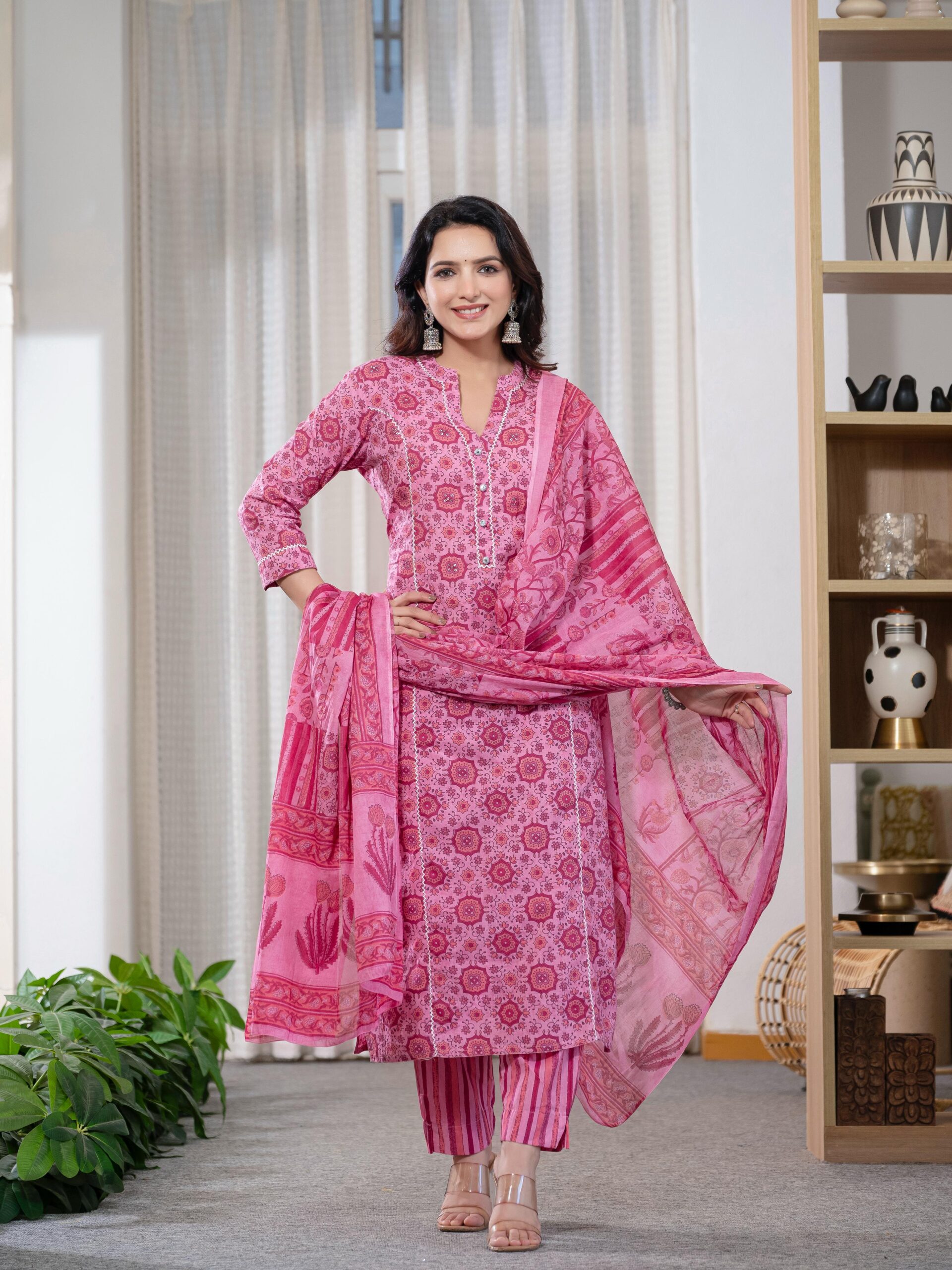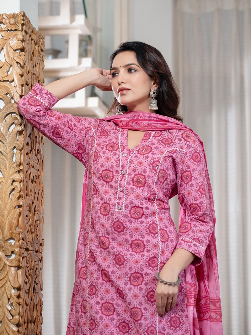 Cotton Summer Pink Kurti Pant And Dupatta Set